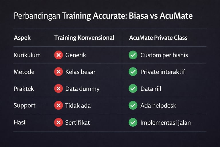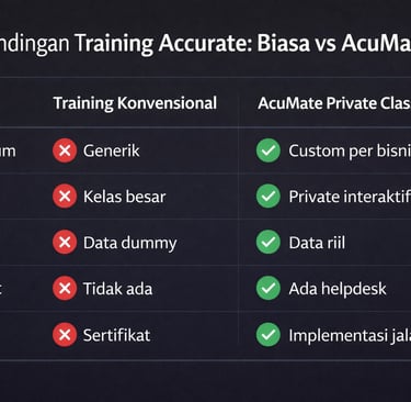 Kalau training Accurate yang kemarin nggak berhasil, bukan berarti Accurate-nya yang susah atau kamu yang nggak bisa belajar. Masalahnya ada di pendekatan training yang salah — terlalu generik, kurang praktis, dan nggak ada support setelah training selesai.